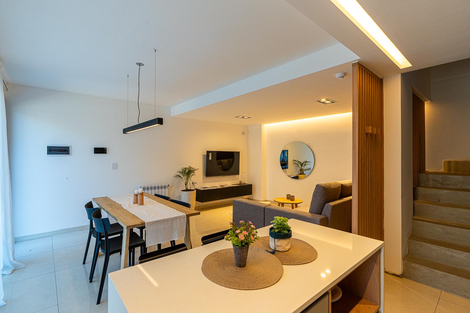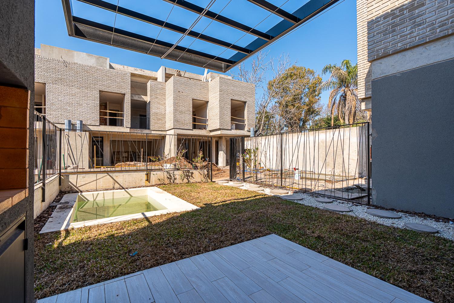 P.B: Jardín exclusivo con pileta de 2,80 x 1,80 y solarium, parrillero y mesada con bacha incorporada. Ingresamos a la propiedad y nos encontramos el estar con comedor diario y un gran ventanal hacia el jardin, cocina integrada con muebles bajo mesada, alacenas y barra desayunadora. Toliette y escalera.