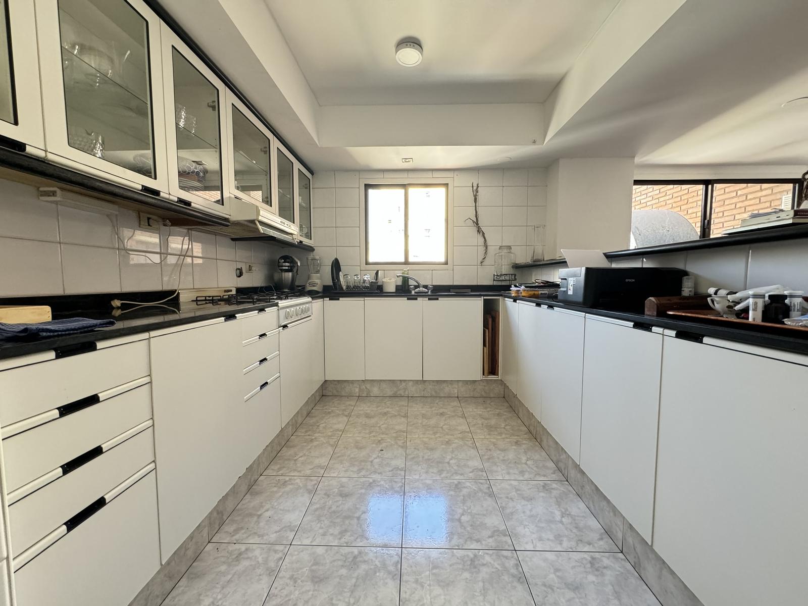 La propiedad cuenta con dos accesos: el principal, que lleva a un luminoso y espacioso living con hogar, y el segundo acceso por la puerta de servicio. La cocina esta completamente equipada con mucho espacio de guardad, alacenas y bajo mesada, espacio para conectar un lavavajillas y una isla que funciona como desayunador. Cuenta con espacio de comedor diario. Desde aqui, se accede a lavadero y cuarto de servicio.