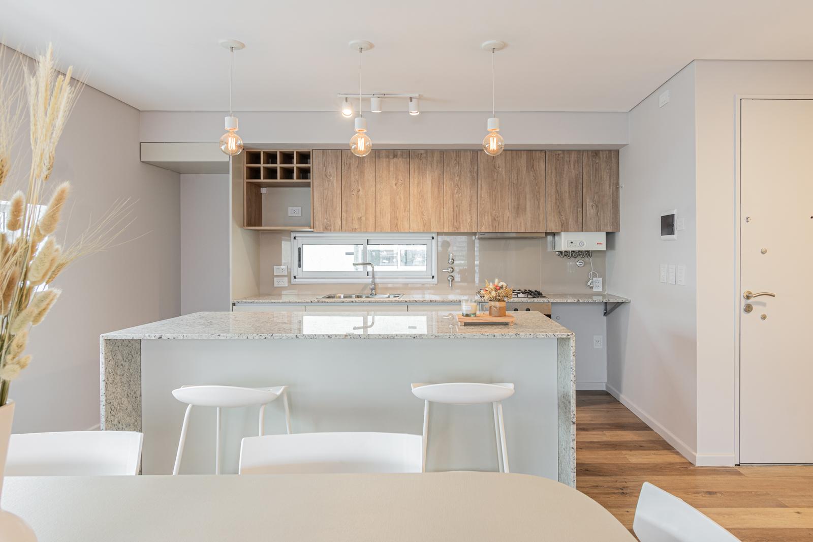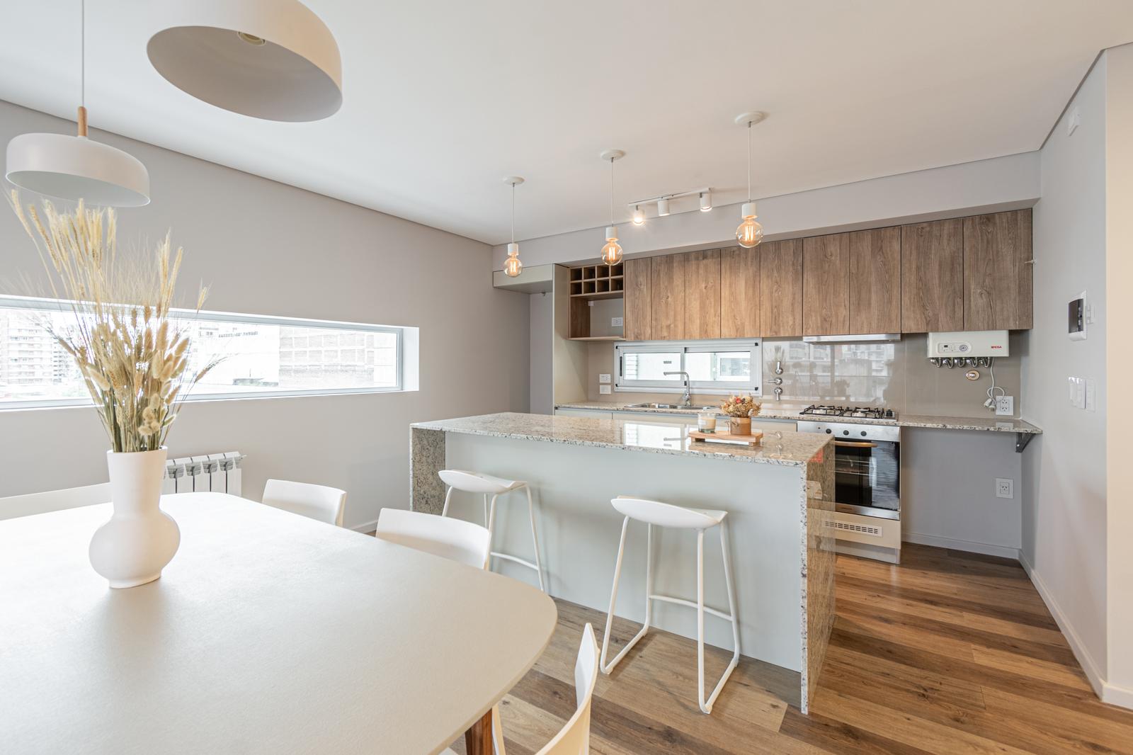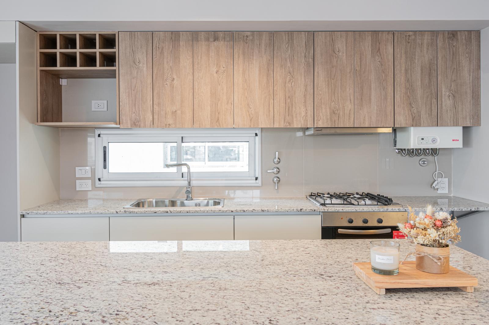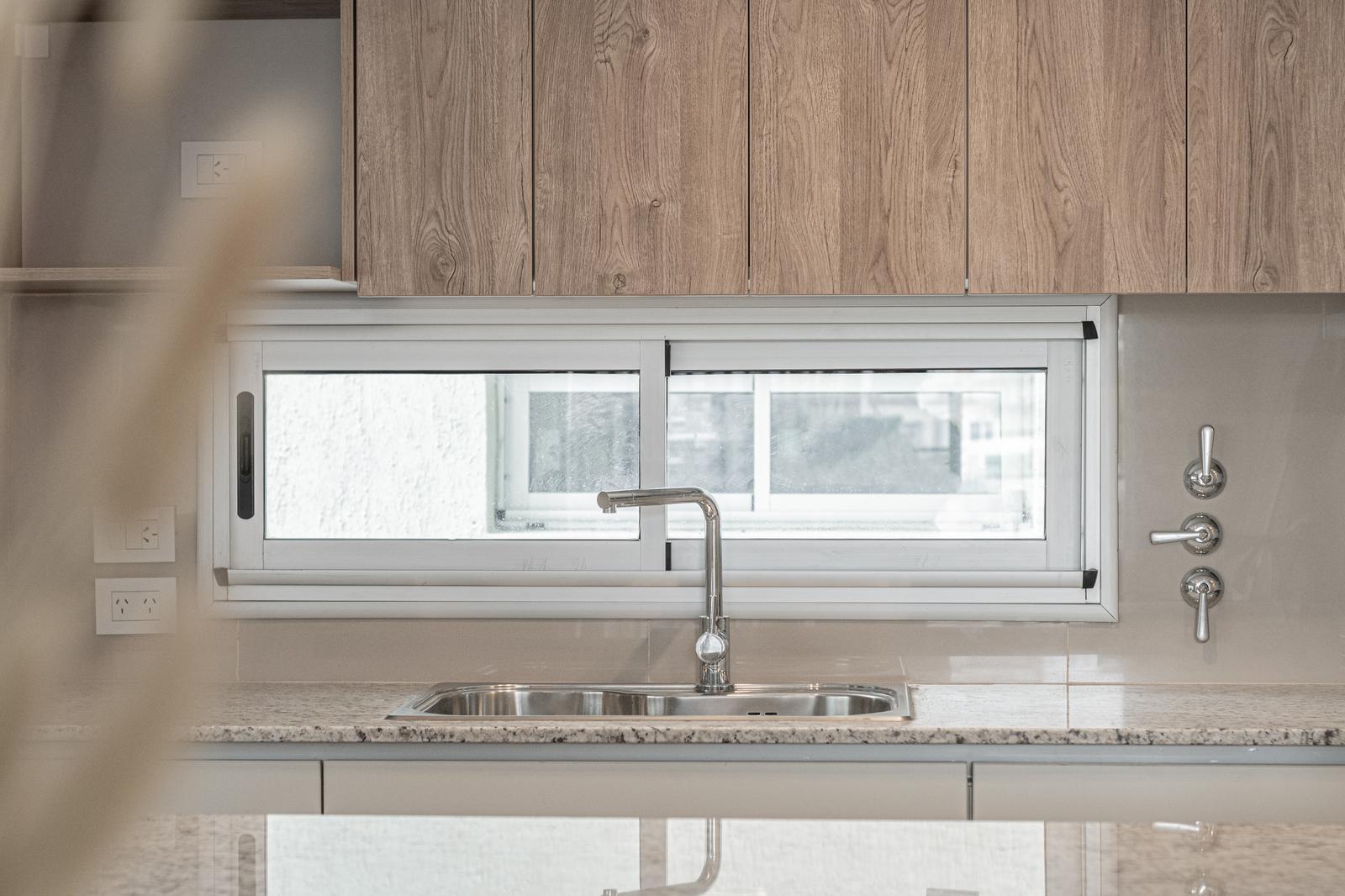 Descripción de la unidad: Departamento de 2 dormitorios con balcon al contrafrente, ingreso por estar comedor con cocina intergada + barra desayunadora. Muebles de cocina completos: bajo mesada, alacenas, porta microondas, bodeguero; mesada en granito gris, pileta de acero inoxidable y grifería monocomando. Ambos cuartos cuentan con placard empotrado completo con guias de aluminio. 2 balcones amplios. Unidad al contrafrente con disposición Norte.