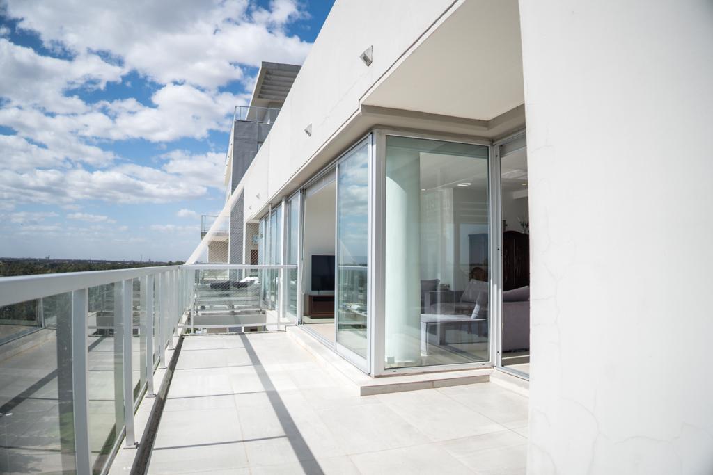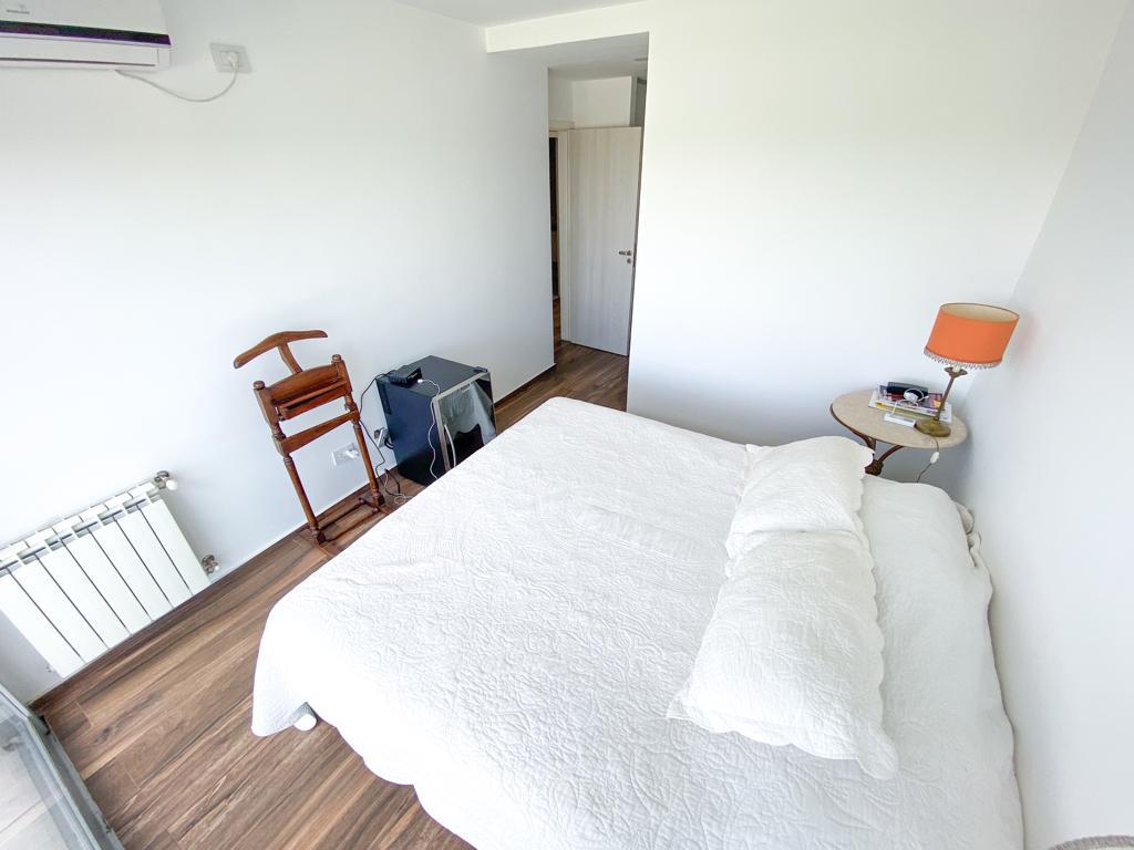 La propiedad cuenta con doble sentido de circulación, ya que, desde la recepción también se puede ingresar a la zona intima donde se encuentran los dormitorios, uno con vestidor y baño en suite, otro de gran dimensión con placar empotrado y un tercero con frente de placard. Los 3 dormitorios con acceso a un balcon terraza con hermosa vista al contra frente y pisos de porcelanato símil madera. Además posee un baño completo con hidromasaje.