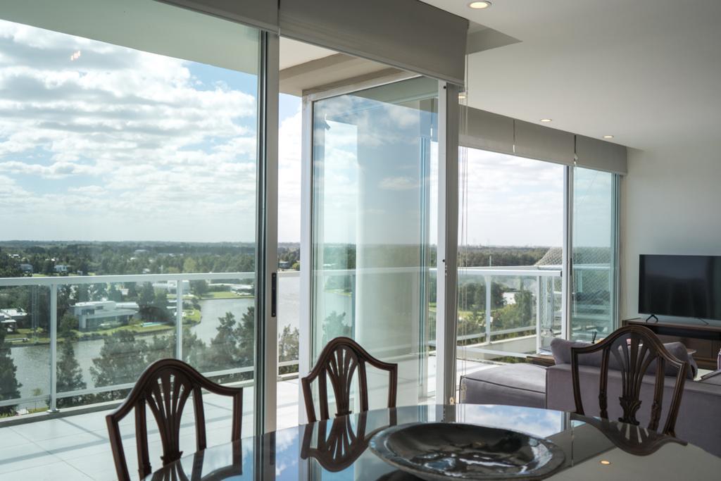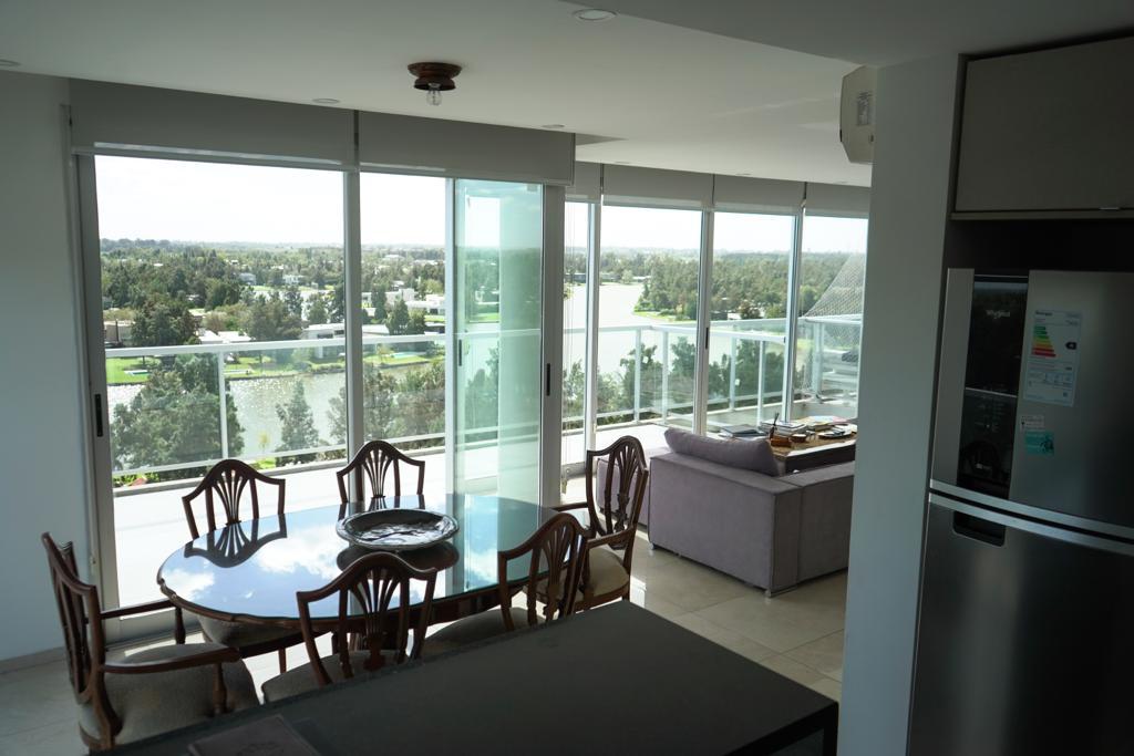 Se accede al edificio por una importante recepción con ascensores modernos, el cuál nos lleva al palier que comparte con otros dos departamentos. Se ingresa por puerta de madera de dos hojas que da al hall de recepción, integrado a un amplio living y comedor en concepto totalmente abierto, con una impactante vista al lago y la arbolada del country del Lago. Salida inmediata a balcón aterrazado con parrillero propio, a través de amplios ventanales a medida, de piso a techo, con marcos de aluminio y DVH, que garantizan una optima iluminación y eficiencia, tanto térmica como sonora. Cocina semi integrada con mesada de granito, amplios mobiliario de diseño con alacenas y bajo mesada, anafe por inducción y horno eléctrico empotrado. Bacha de acero inoxidable, grifería monocomando de calidad. Lavadero independiente semi cubierto.