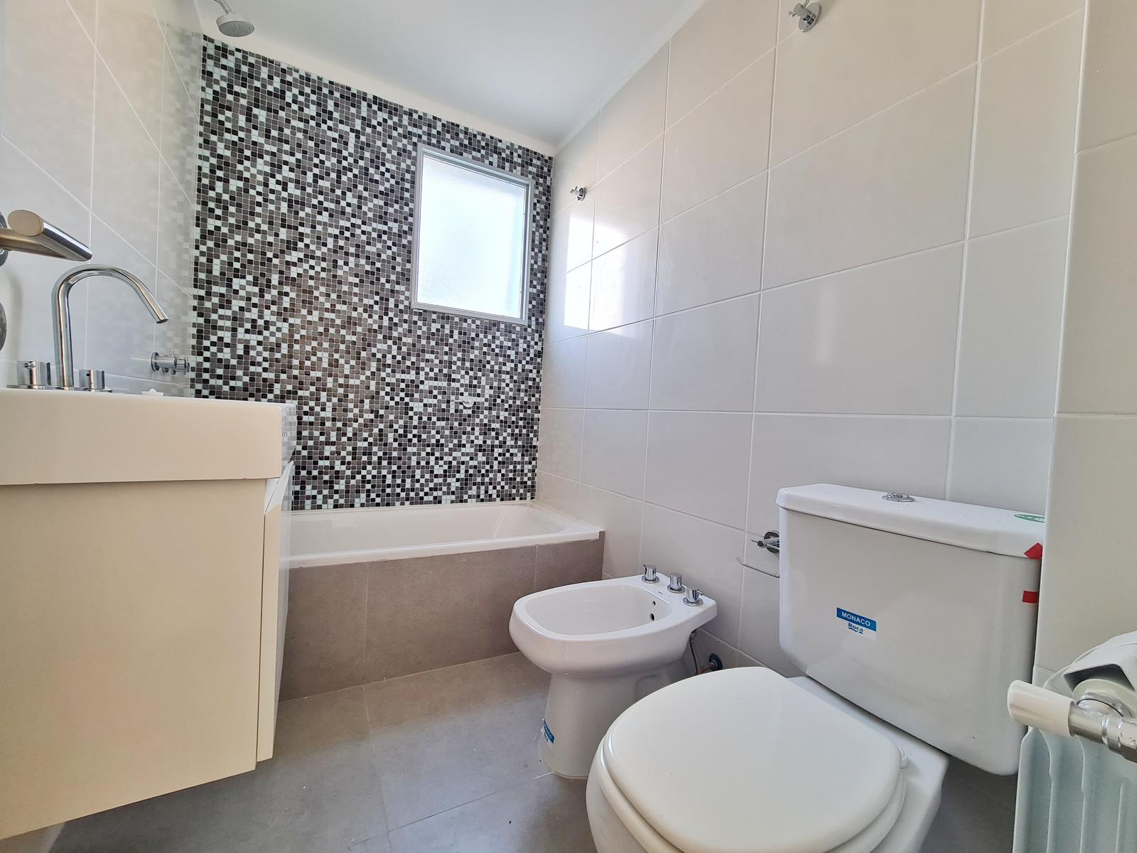 Continuando, nos encontramos con dos puertas: una que conduce hacia el frente, llevándote al dormitorio principal, y otra a la derecha que te lleva al baño. El dormitorio cuenta con un placard empotrado con interiores, como cajoneras y barral, y puertas con espejo. El baño es moderno y completo, diseñado con elegancia y funcionalidad.