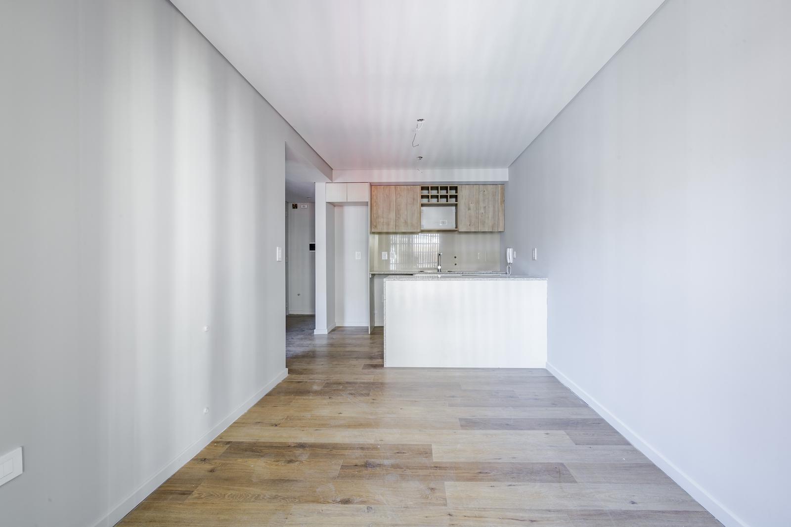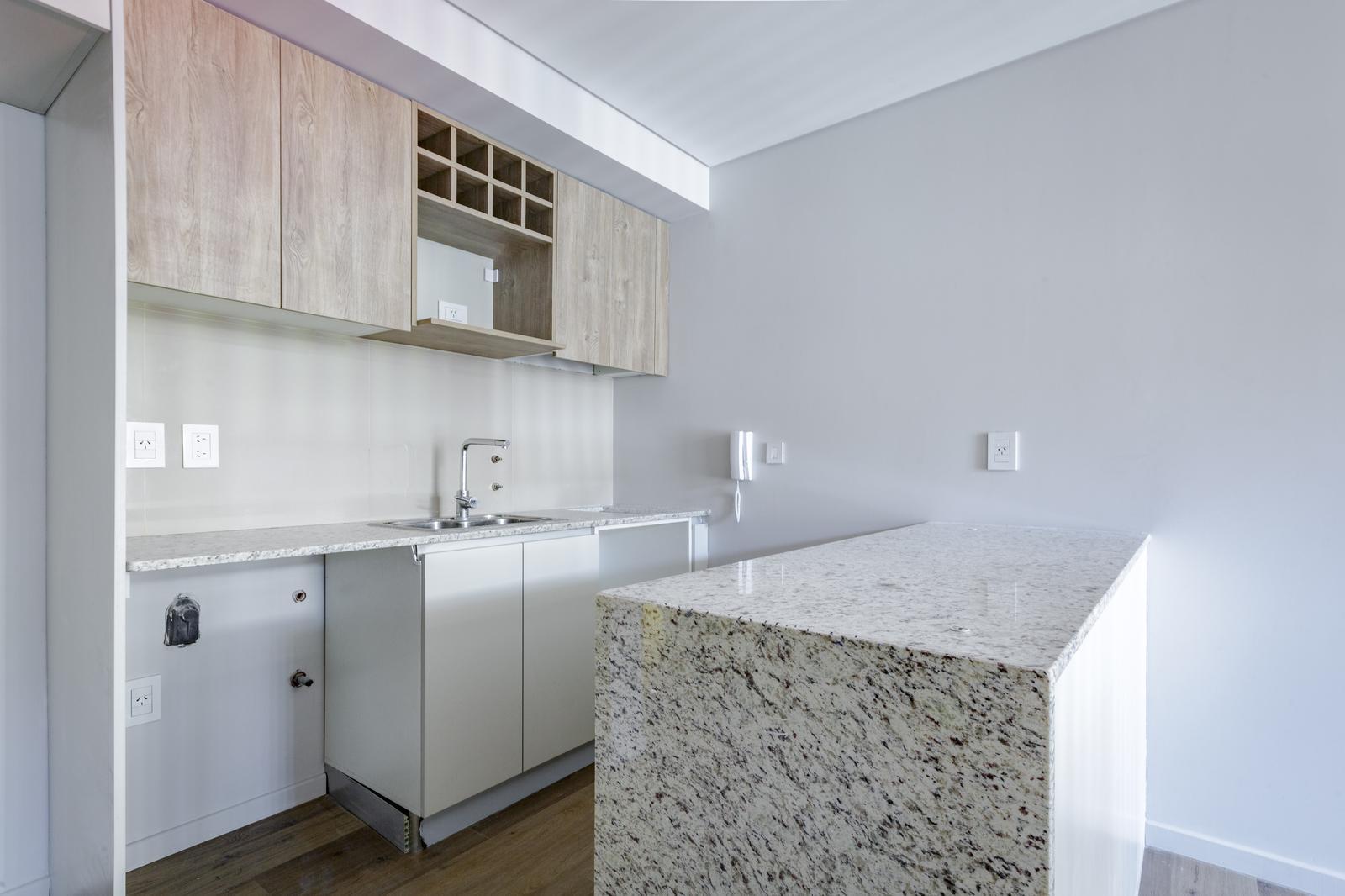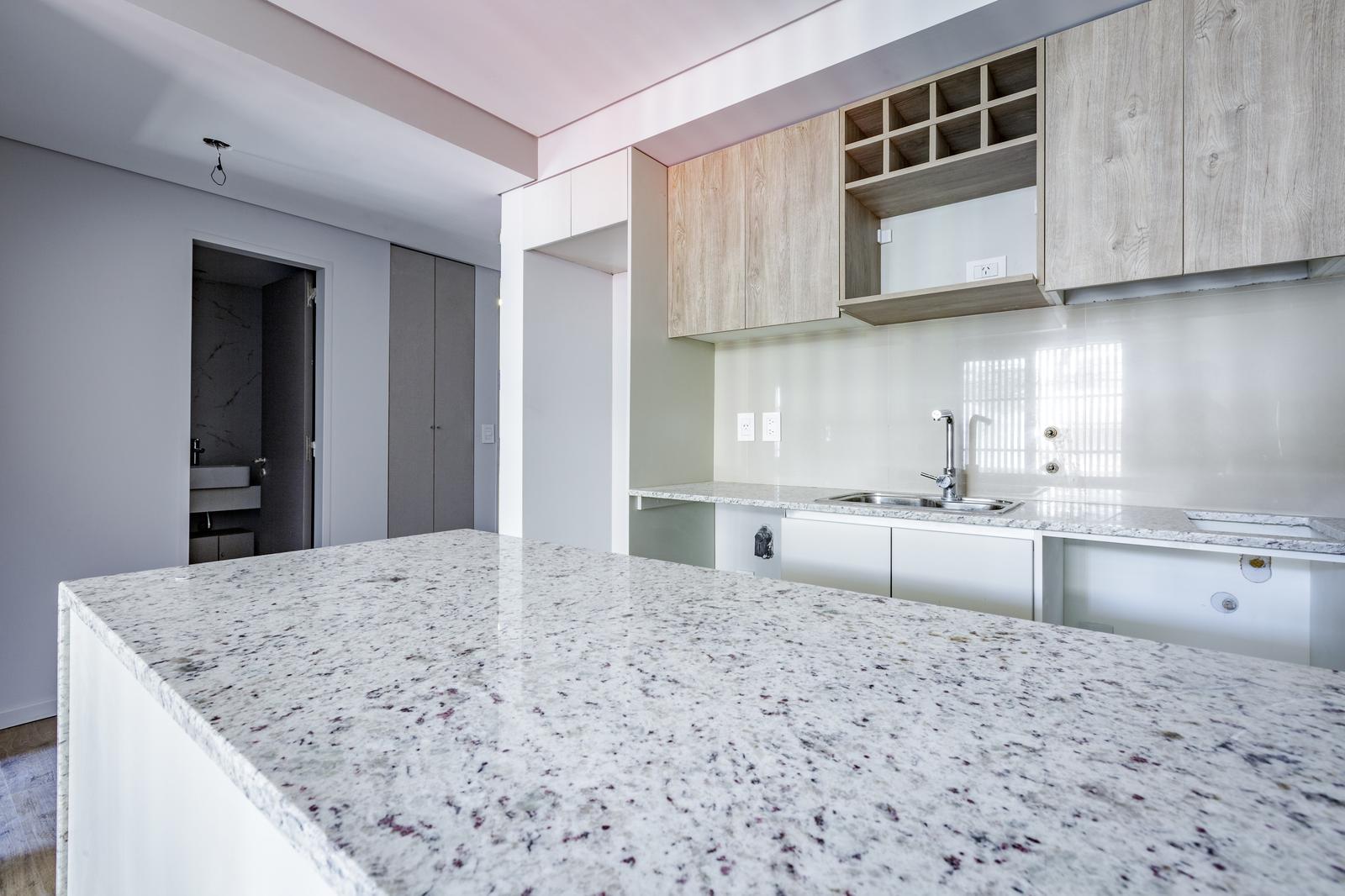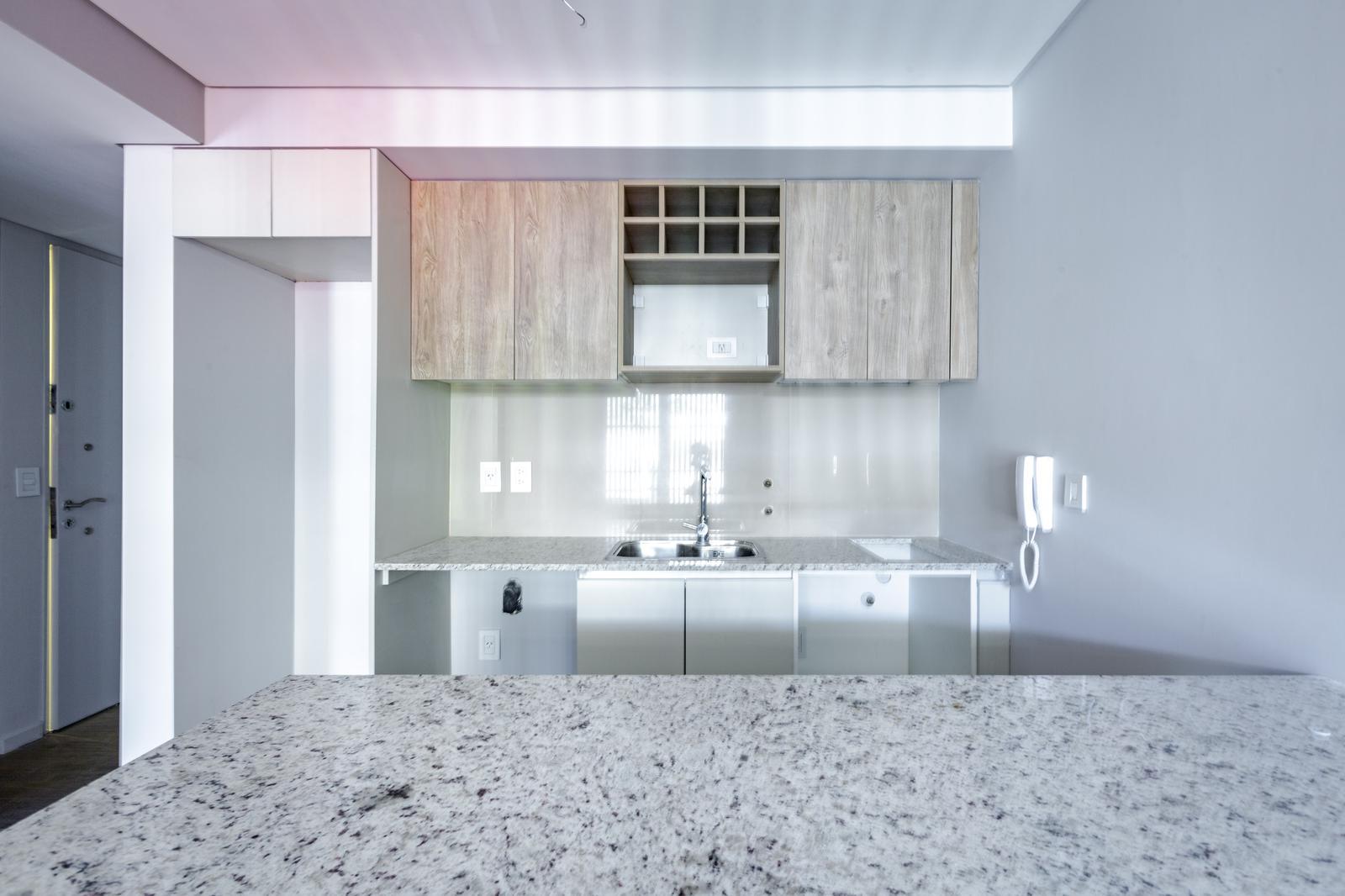 Descripción de la unidad: Departamento de 1 dormitorio, ingreso por living comedor con cocina intergada + barra desayunadora. Muebles de cocina completos: bajo mesada, alacenas, porta microondas, bodeguero; mesada en granito gris, pileta de acero inoxidable y gritería monocomando. Placard empotrado completo con guias de aluminio. Unidad al frente con disposición Sur.