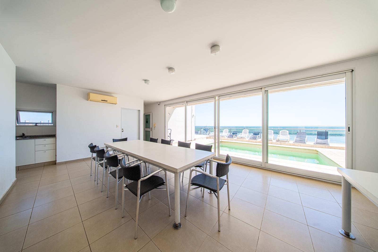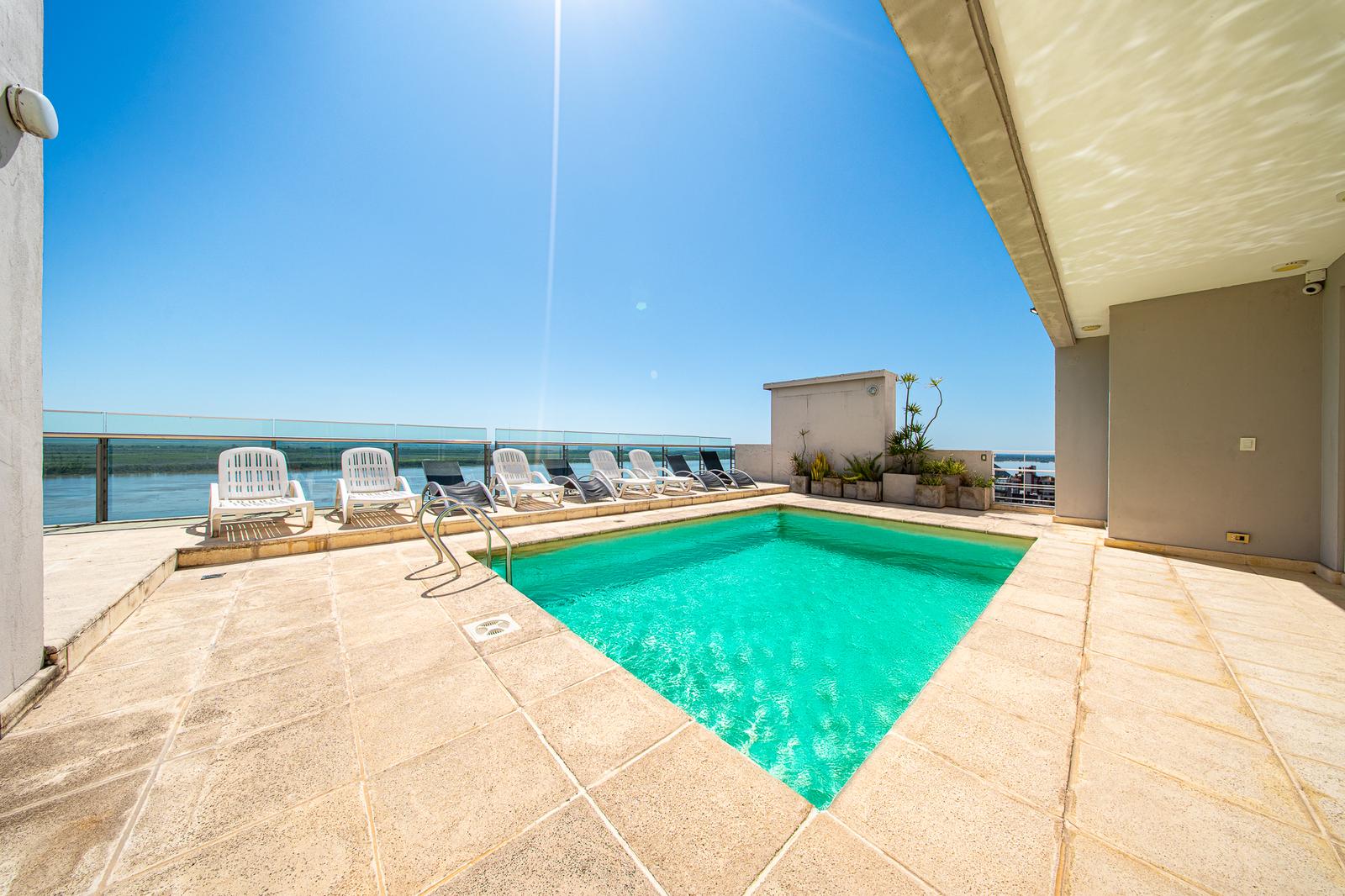 Piso 7-01.Edificio SCALA 20: Calidad garantizada.Caldera dual y calefaccion por radiadores. Pisos de madera entablonada y porcelanato en espacios humedos. La unidad cuenta con un equipo de aire acondicionado y cortinas roller black out.Aberturas con DVH.Balcon de amplias dimensiones, que mira al Norte y tiene parrillero. Dormitorios con placares empotrados y sector de escritorio en dormitorio secundario.Orientacion: Norte.Superficie exclusiva: 84,35 m2 (75,90 cubiertos y 8,19 m2 de balcon).Estado impecable. Entrega inmediata.Edificio con seguridad y porteria las 24 hs. Amenities: En la terraza, SUM equipado, parrillero y Pileta con una vista increible al rio Parana. Cochera incluida en el valor.Año de construccion: 2010.